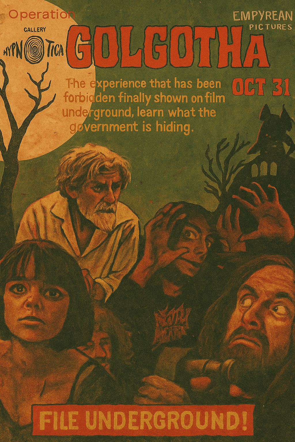 This Halloween, the underground awakens. Hidden from public view for decades, Operation GOLGOTHA emerges from the vaults of cinematic rebellion for one forbidden night in Austin. Part séance, part screening, part collective hallucination—this event invites you to step inside the myth itself.
