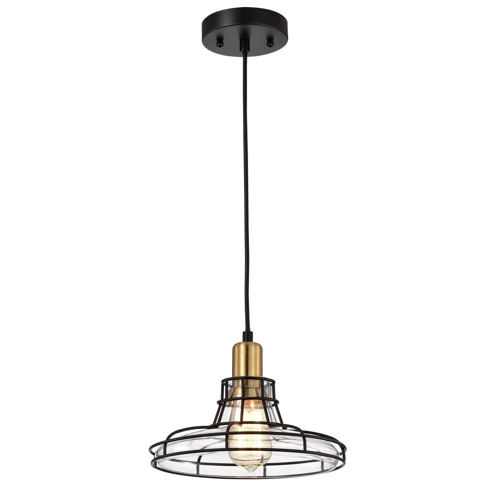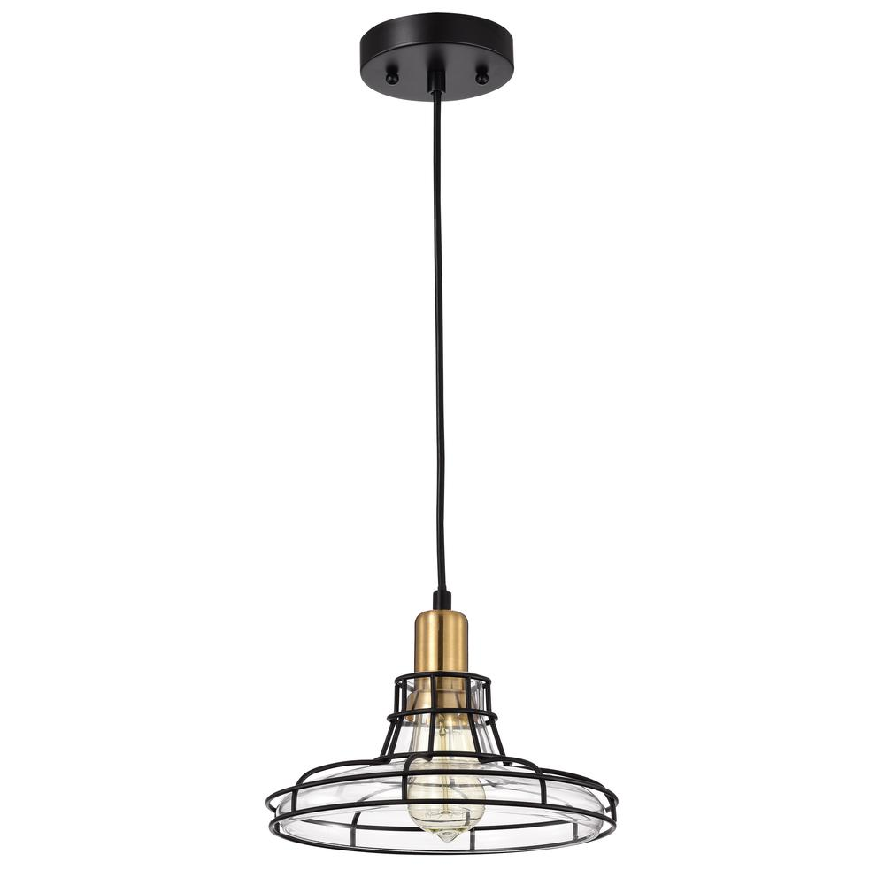 Gianna, a 1-light pendant features a black and burnished brass finish that will complement many transitional decors. The round shaped clear glass, provides uninterrupted light to any space. This fixture is downlight direction, and takes one 100W E26 bulb, and is compatible with flourescent, incandescent, and LED bulbs. UL Listed, Dry listed and recommended for an indoor setting only. Can be installed on a sloped ceiling.