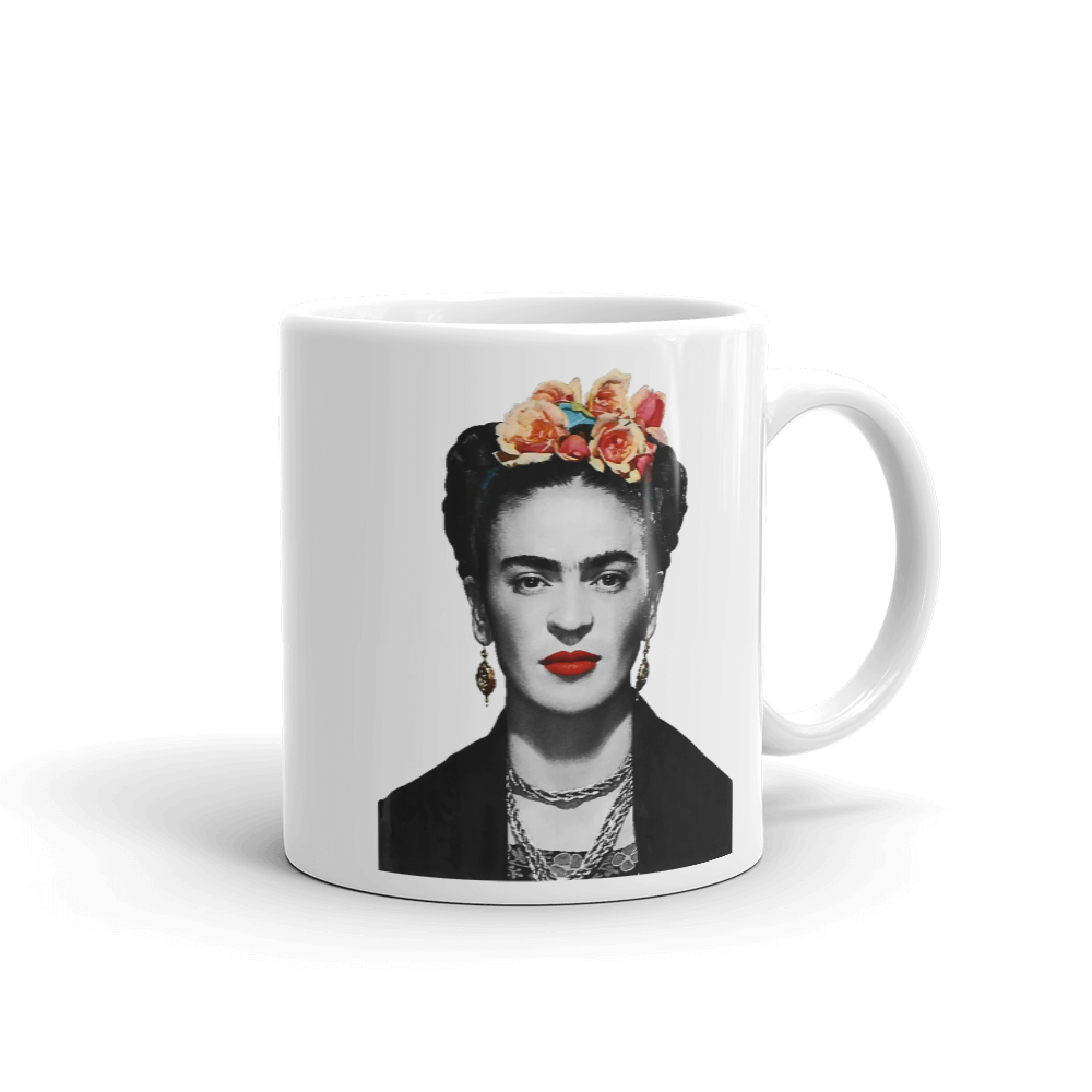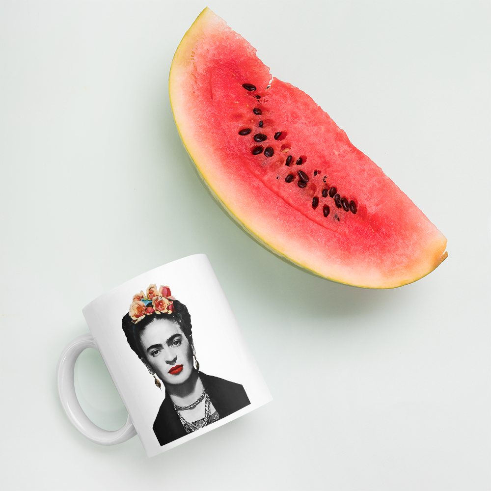 This amazing mug features the iconic mexican artist Frida Kahlo, in grayscale, but with the lips and the roses in colors, creating a beautiful contrast. Inspired by Mexico's popular culture, she employed a naïve folk art style to explore questions of identity, postcolonialism, gender, class and race in Mexican society.