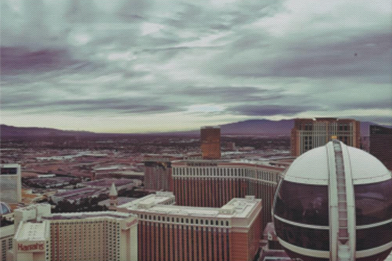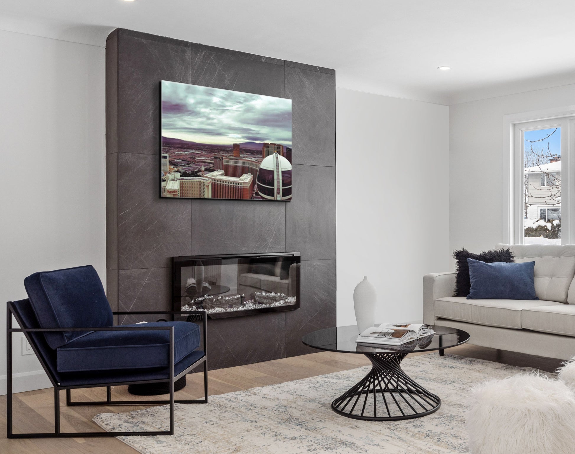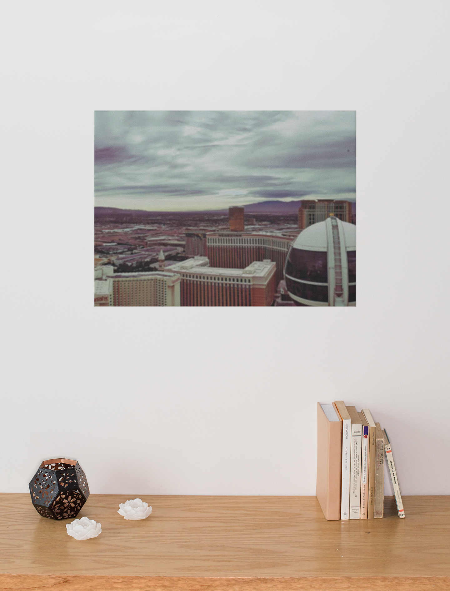 Juno Black's shot "Vegas From The Top" captures the cloudy skyline of Las Vegas, NV from the top of the famed High Roller Ferris wheel. This picture highlights the city's magnificence and attractiveness, emphasizing its tall structures and energetic atmosphere. A neutral gray sky is used as a backdrop to let the city lights stand out and to create a special somber atmosphere. This image is certain to stand out and make an impact whether it is exhibited in a home, workplace, or business setting.