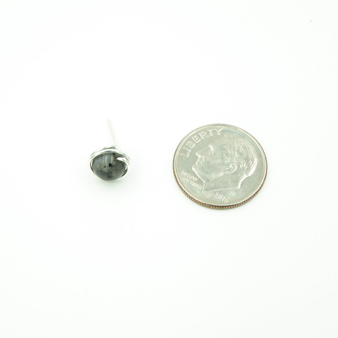 A stunningly iridescent Black Moonstone wrapped in Sterling Silver makes this single stud post a shimmering, glowing centerpiece. The 6mm stone is small to medium sized, so it can be worn from the bottom to mid-way up the ear - although if you have larger ears it could be worn higher. Check your ear size and find out!