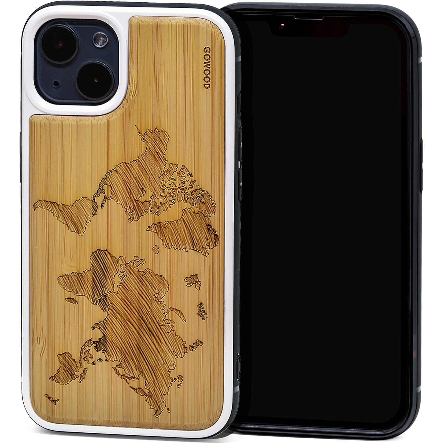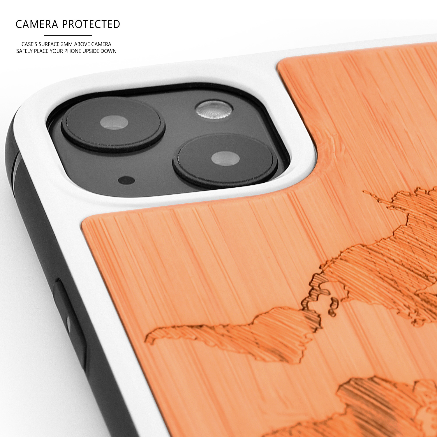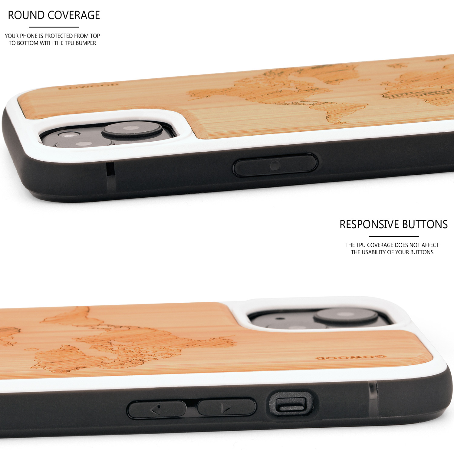 iPhone 13 bamboo wood case world map engraved backside with TPU bumper