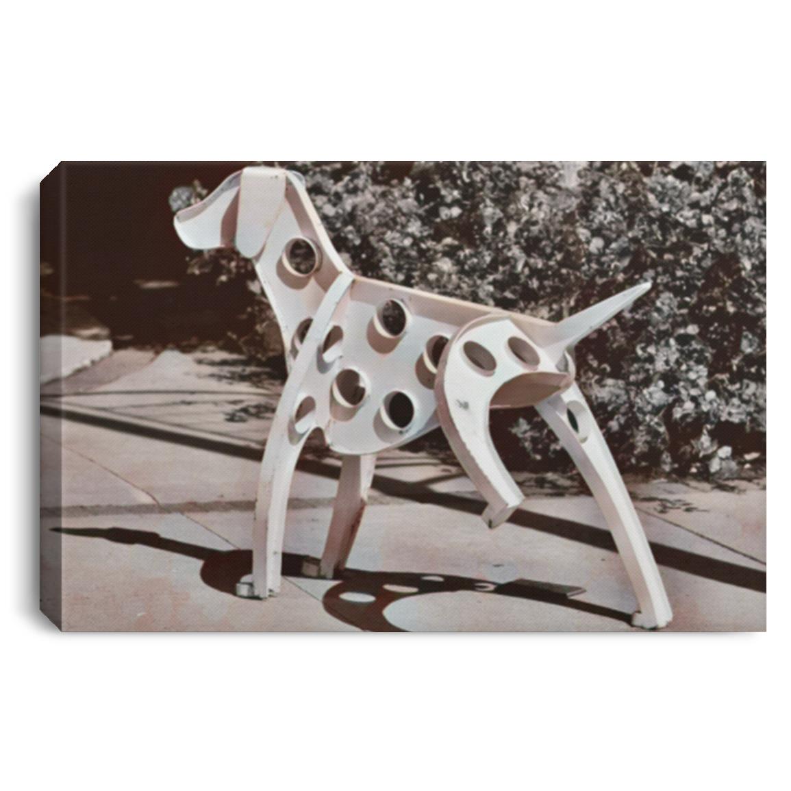 Introducing "Metal Mascot Also Has to Pee" by renowned photographer Juno Black - a stunning landscape canvas print that captures the essence of humor and art in a mesmerizing way. This piece is a photograph of a metal sculpture depicting a dog about to go about his business, creating a unique and eye-catching image.