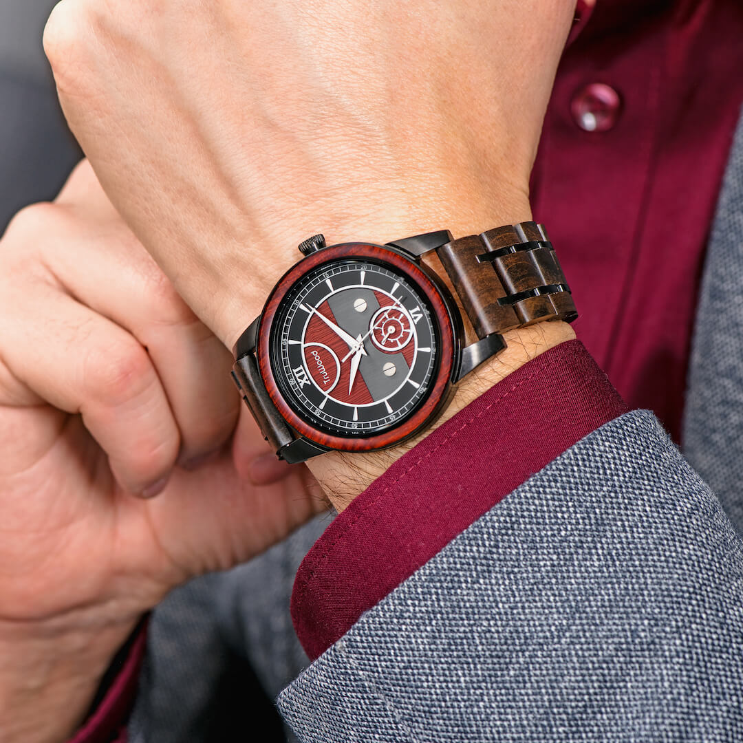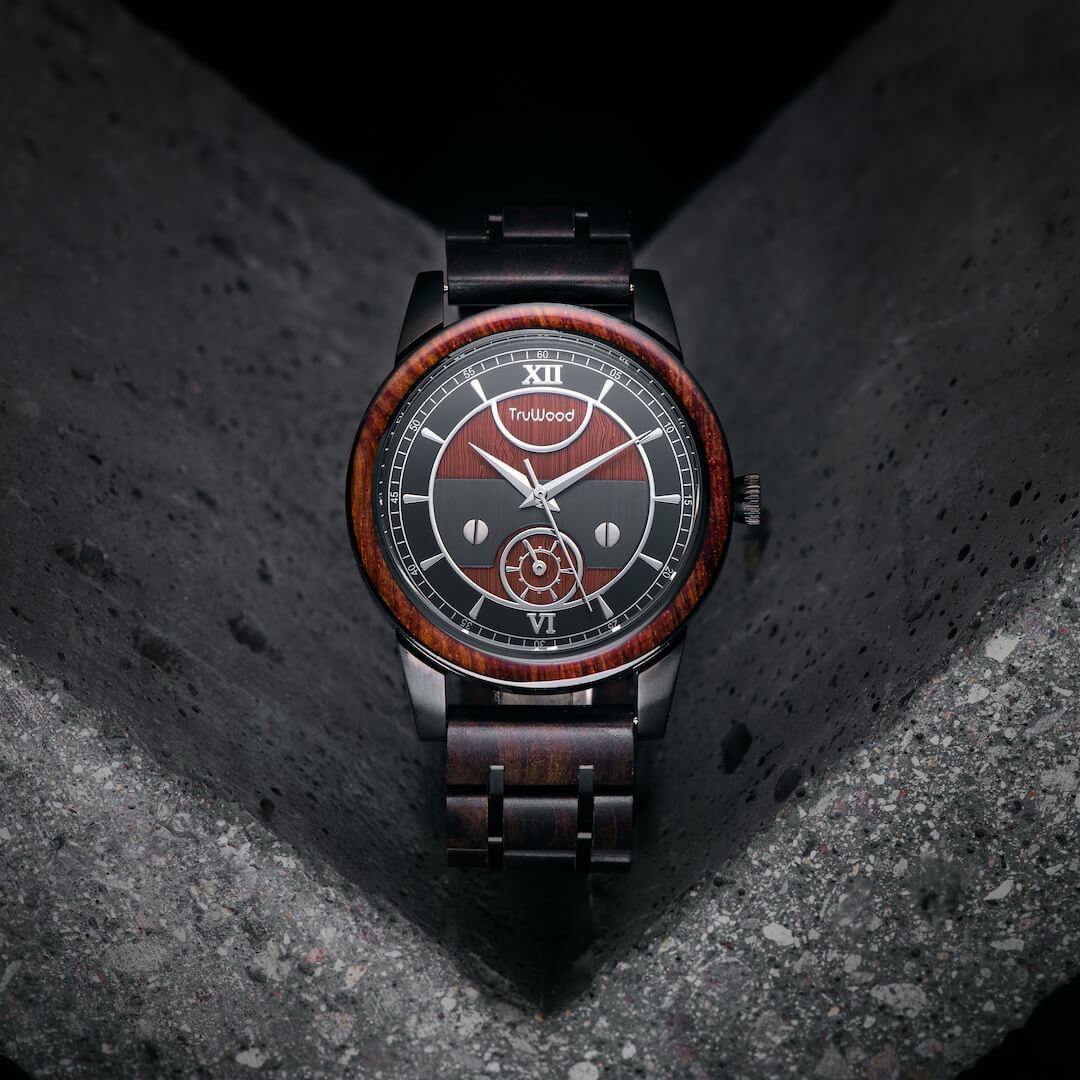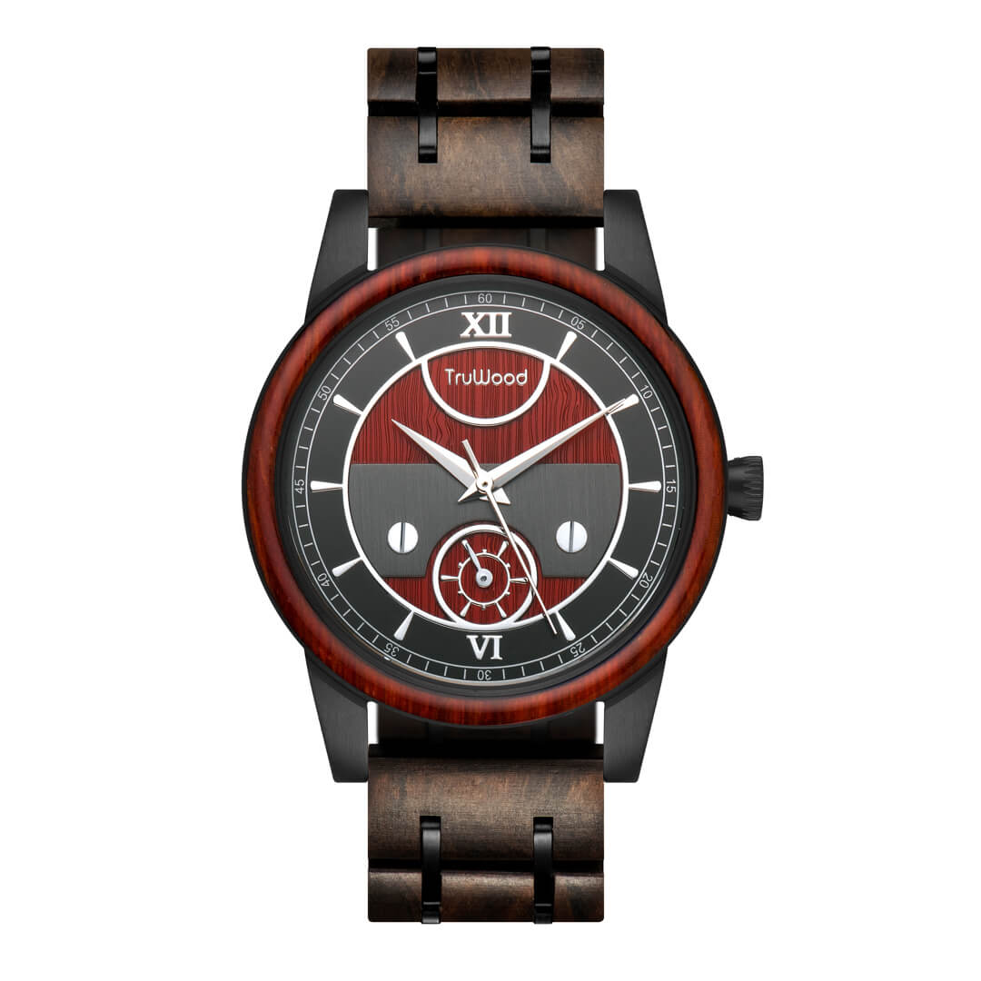 The TruWood Napoleon watch is a paradigm shift. Inspired by the human drive to explore in mind, this collection serves as a reminder to discover and achieve the unattainable. Each Napoleon timepiece is crafted with hand-picked black and red sandalwood, salvaged from reclaimed boats that have traversed the oceans. The polished wooden link band is held together by black stainless steel lugs and clasp, topped with a redwood bezel reminiscent of history's greatest explorers. This watch rests lightly on your wrist, sporting a subtle sub dial so you can look your best when delving into uncharted territory.