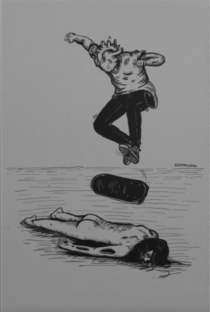 Gordo Ilustra's Ollie canvas captures the intensity and enthusiasm of skateboarding culture by depicting a skater jumping over a reclining woman. This work, which is printed on high-quality canvas and features Gordo's distinctively strong lines and vibrant colors, is the ideal addition to any living room, bedroom, or workplace setting. The canvas is skillfully stretched and set in a durable hardwood frame to make sure it will last a long time and be a focal point in your room. Gordo Ilustra's Ollie canvas is the ideal option for you if you enjoy bright and original art or are just a fan of skate culture.