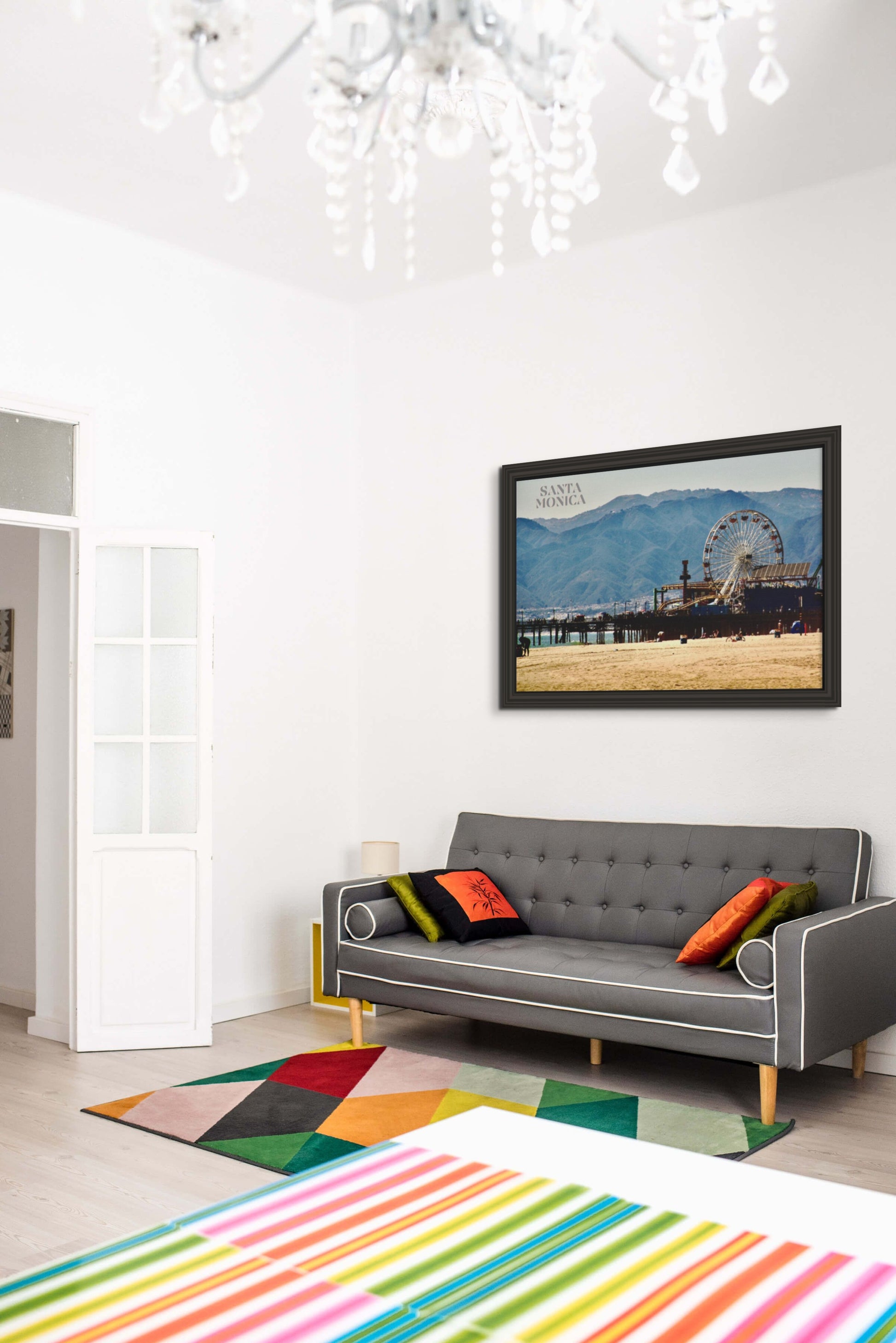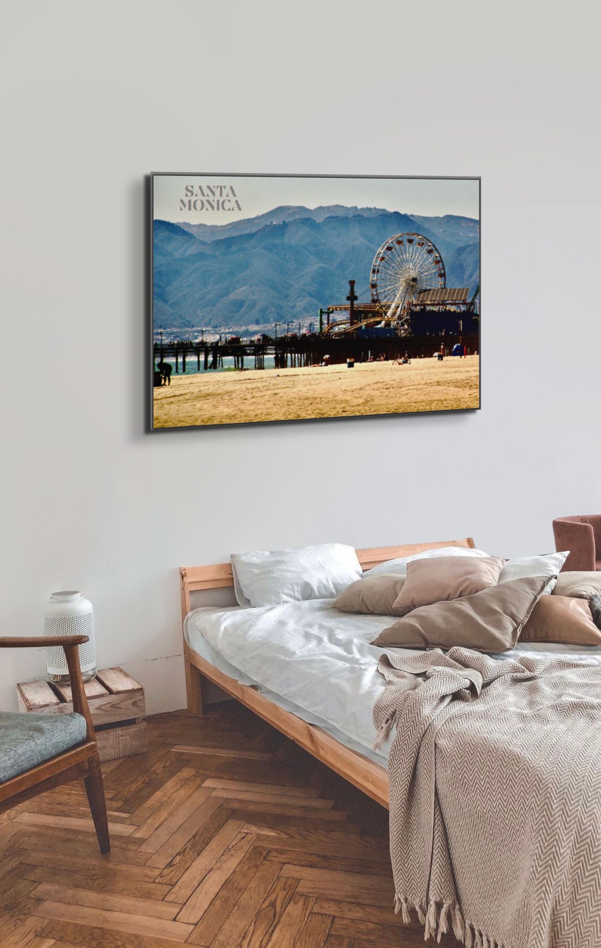 Decorate your home with Juno Black's breathtaking landscape image, "Santa Monica Wheel." This colorful image, printed on canvas of the highest caliber, perfectly depicts the mood of a bright day at the Santa Monica beach while showing the famed Ferris wheel park. This piece will stand out in any space because of Juno's experience in photography and skill in capturing breathtaking scenes. Order right away to bring Santa Monica's enchantment into your house.