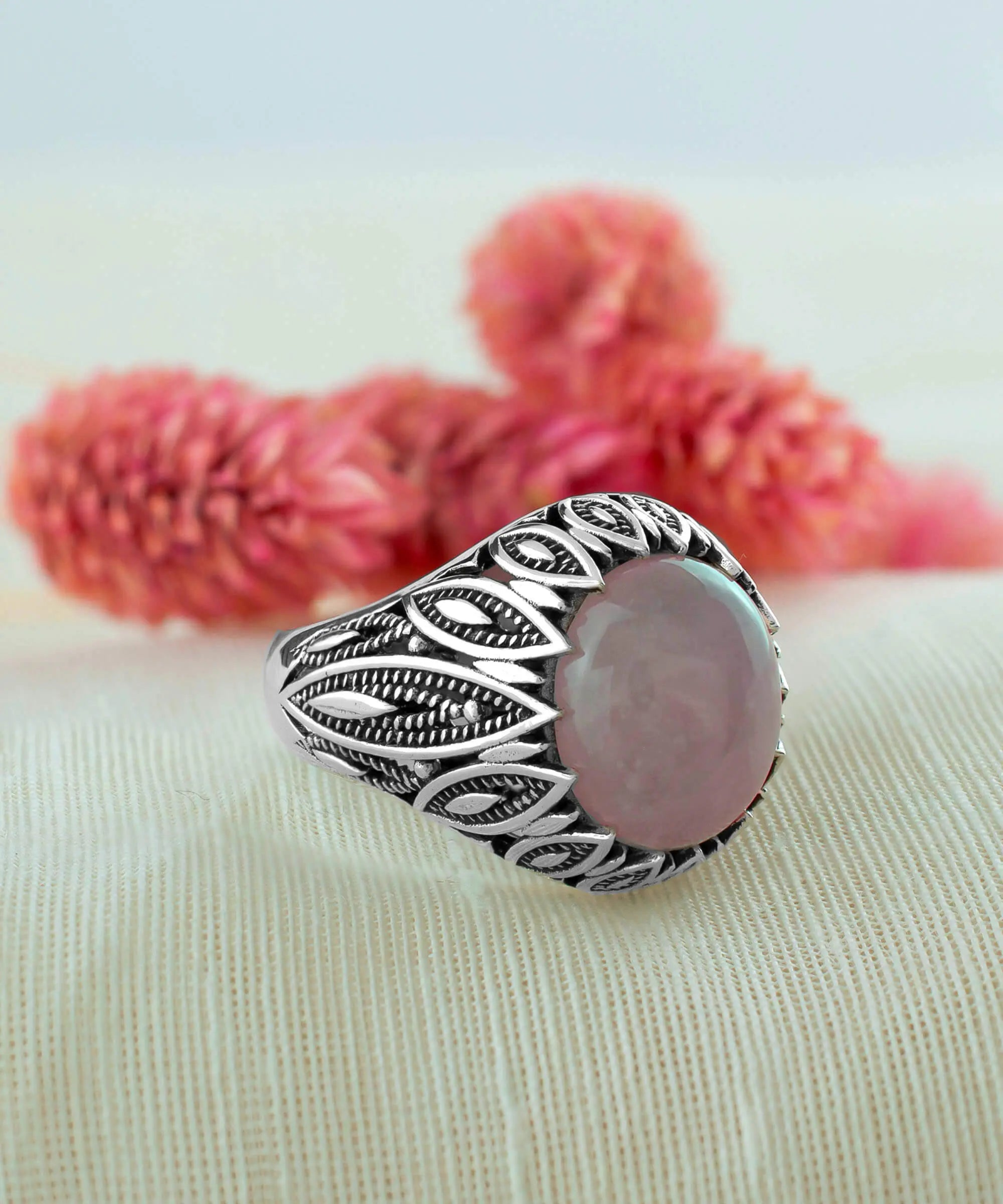 Sterling Silver Filigree Art Rose Quartz Gemstone Women Statement Ring